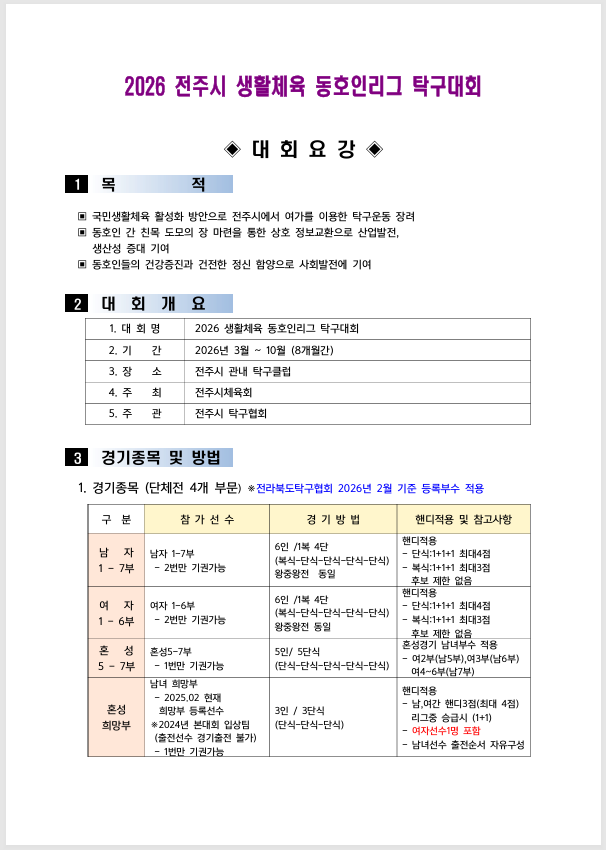 | [공지] 2026전주시 생활체육 동호인리그 탁구대회 요강 및 참가신청서 | |