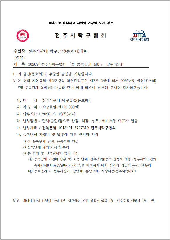 | [공지] 2026년 등록단체 회비 납부 공문(2026.02.14임시총회 결과에 따른 재공문) | |